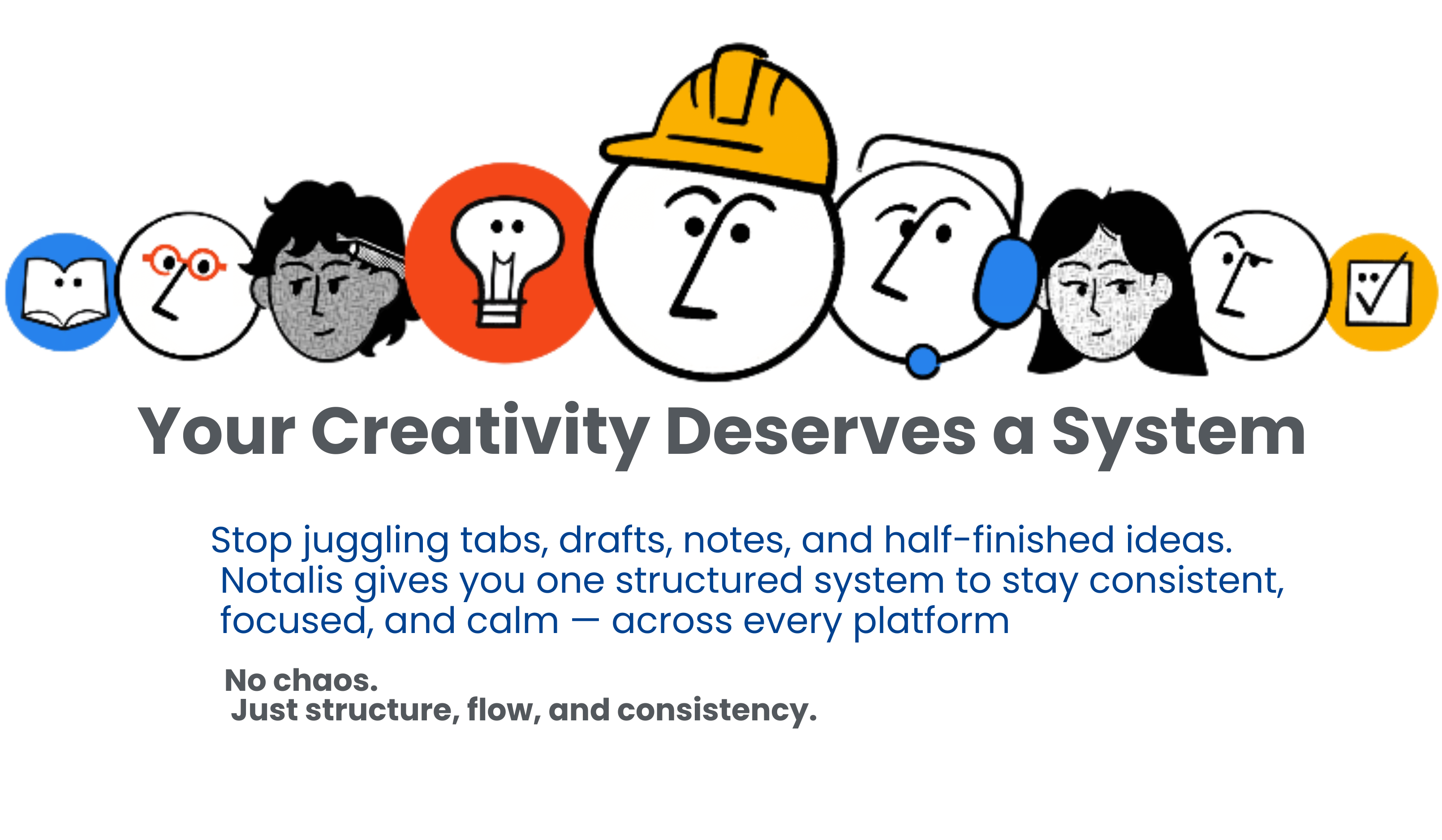 From studying creator behaviour and testing full content workflows, I turned what worked into Notalis — a calm, structured workspace made for real creators, not corporate teams.